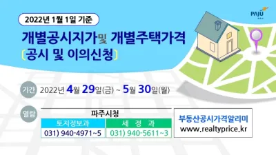 파주시, 2022년 1월 1일 기준 개별주택가격 공시 파주시는 2022년 1월 1일 기준 개별주택가격을 4월 29일 결정·공시하고, 5월 30일까지 이의신청 기간을 운영한다고 밝혔다. 시는 개별주택 2만2,891호에 대해 가격을 산정하고 한국부...