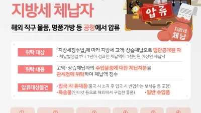 경기도, 지방세 체납자의 해외 직구 물품과 해외여행시 구매한 명품백 등 공항서 압류 오는 6월부터 경기도 지방세 고액․상습체납자가 해외여행 후 입국할 때 휴대한 명품이나 해외 직구 물품이 공항에서 바로 압류된다. 경기도는 ‘지방세징수법’ 개정에 따...