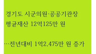 2022-03-31 02:13:34경기도 시군의원·공공기관장 평균재산 12억125만 원…전년대비 1억2,475만 원 증가