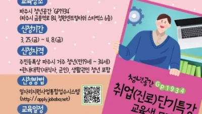 파주시, 청년공간‘GP1934’4월 단기특강 참여자 모집 - 2022년 달라지는 취업시장과 전망 파주시(시장 최종환)는 청년공간 ‘GP1934’에서 지역 청년들의 사회참여 기회 및 취업(진...