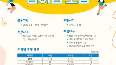 경기도, 27일까지 ‘청년공동체 활동지원’ 공모…활동비 최대 800만 원 지원 ○ 모집 기간 : 2022년 1월 27일 오후 6시까지 ○ 지원 대상 : 도내 거주하고 있는 만 20세 이상 39세 이하 청년 5인이상으로 구성...