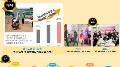 전문가, 도민, 온라인 시청자 평가점수를 합산하여 정책개선 우수사례 순위 결정 경기도민이 뽑은 올해 최고의 성평등 정책으로 여성 신규농업인 양성에 기여한 경기도농업기술원의 ‘신규농업인 기초영농기술교육 지원’이 선정됐다. 경...