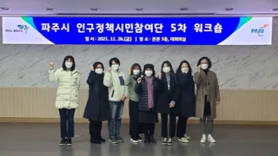 파주시 인구정책 시민참여단 활동 성료 -파주시민이 주도로 만들어가는 맞춤형 인구정책! 파주시는 26일, 파주시 인구정책 시민참여단의 마지막 워크숍을 개최했다. 지난 7월에 개최된 위촉식과 역량강화 교육을 시작으로, 매월 정책 토론 워크숍과 교육 등을 통해 ...