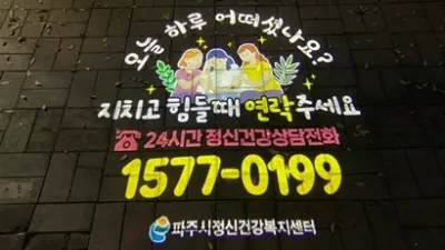 파주시, 자살 예방을 위한‘생명사랑 로고젝터’설치 파주시(시장 최종환)가 운영하는 파주시정신건강복지센터(이하 센터)는 지난 17일 생명사랑 문구를 담은 ‘생명사랑 로고젝터’를 파주시 내 2...