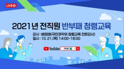 파주시, 전 직원 반부패 청렴교육 실시 - 공직 청렴문화 확산과 실천의지 제고 파주시가 지난 21일 파주시 공직자를 대상으로 올바른 공직관 정립 및 신뢰받는 공직문화 확산을 위한 ‘2021년 전 직원 반부패 청렴교육&rs...