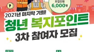 경기도, 연간 120만원 ‘청년 복지포인트’ 마지막 3차 참여자 6천명 모집 ○ 모집 기간 : 11월 1일(월) 오전 9시부터 11월 15일(월) 오후 6시까지 - 120만원 상당 복지포인트 경기청년몰에서 사용 - 경기도 소재 중소&m...