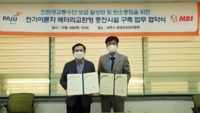 파주시-(주)엠비아이, 친환경 교통수단 보급 확대·기반 구축 위해 손잡아 - 전기이륜차 공유형 배터리 충전시설 설치 업무협약 체결 파주시는 친환경 교통수단 보급 확대 및 충전 기반 구축을 위해 전기이륜차 전문업체인 ㈜엠...