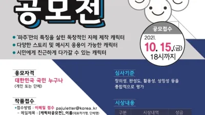 파주시 대표 캐릭터 찾아라! 시민과 함께 만드는‘파주시 캐릭터’공모전 진행 파주시가 ‘파주’를 대표하는 캐릭터를 공모한다. 공모를 통해 파주의 특징을 살린 독창적인 캐릭터를 발...