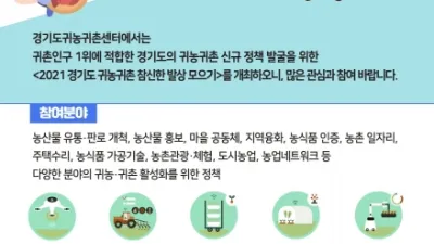 “귀농·귀촌 참신한 정책 아이디어 받습니다”…도, 9월 10일까지 공모 ○ 2022년 경기도 귀농귀촌 정책 제안을 위한 참신한 아이디어 발굴 ○ 공모 기간 : 8월 11일부터 9월 10일까지 - 대상 100만 ...