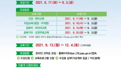 2021-08-09 09:48:03파주시 평생학습관, 제3기 온라인 강좌 수강생 모집 - 8월 17일부터 86개강좌 1,730명 모집