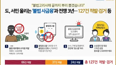 2021-07-22 03:29:23경기도, 서민 울리는 ‘불법 사금융’과 전쟁 3년…대부업법 위반범죄 127건 적발