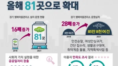 2021-07-05 01:31:07경기도, 경기 행복마을관리소 당초 목표 초과달성. 올해 81곳으로 확대 - 도, 전국확대 및 사업 지속성 확보 위해 중앙정부 제도화 협의 중