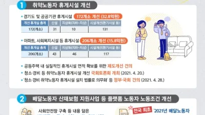 청소·경비·배달노동자의 쉴 권리·일할 권리에 주목한 경기도의 정책들 ○ 공공기관, 아파트, 대학교 등 청소경비노동자 휴게시설 378개소 개선 ○ 전국 최초 배달노동자 산재보험 지원 개시, 공공기관에 택배차량 전용주차면 ...