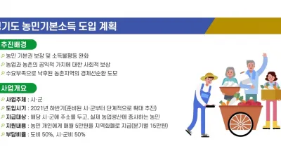 경기도, 이르면 10월 준비된 시군부터 농민기본소득 지급. 매월 5만원씩 지역화폐로 ○ ‘경기도 농민기본소득 기본계획’ 경기도 기본소득위원회 심의를 거쳐 확정 ○ 올해 하반기 준비된 시군부터 농업 생산에 종사하는 농민에게 기본소득 지급...