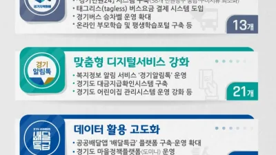 경기도, ‘디지털 대전환’으로 도정 혁신…도민중심 행정서비스 강화 ○ 경기도, 민선7기 4대부문 9개분야 57개 ‘디지털 경기’ 프로젝트 추진 - 공공비대면 서비스 제공, 맞춤형 디지털 서비스 강화, ...