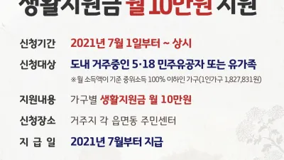 경기도, 5·18민주유공자와 유족에 7월부터 월 10만 원 생활지원금 지원 ○ 경기도 거주 5·18민주유공자 및 유족에 생활지원금 지원 ○ 7월 1일부터 거주지 읍·면·동 주민센터에서 신청 접수 ...