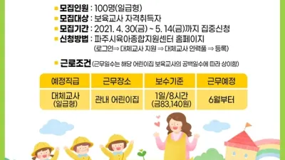 2021-05-03 01:56:08파주시, 어린이집 일급형 대체교사 인력풀 모집 - 보육교사 코로나19 백신 접종시 보육공백 방지