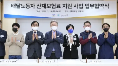전국 최초 배달노동자 산재보험료 지원나선 이재명 “대한민국의 모범 선례 만들 것” ○ 18일 전국 최초 경기도 플랫폼 배달노동자 산재보험료 지원사업 업무협약 체결 - 경기도, 근로복지공단, 경기도일자리재단 협약기관으로 참여 ○ 올해 배...