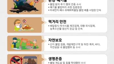경기도, 도민 생활과 밀접한 민생분야 불법·불공정행위 집중 수사 환경 / 먹거리 안전 / 자연보호 / 생명존중 / 생활안전 등 분야별 올해 수사계획 발표 ○ 폐기물 등 환경분야 중점 수사, 하천·계곡, 바다, 먹거리 안전, 동물보호...