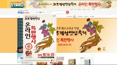2020년 파주개성인삼 드라이브스루 행사 개최 온라인 특판행사(파주팜) 병행 추진 파주시는 10월 개최 예정이던 파주개성인삼축제 취소에 따라 농산물 판매를 위한 특판행사를 추진한다고 6일 밝혔다. 시는 코로나19 장기화에...