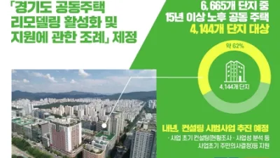 경기도, 노후 공동주택 리모델링 지원 본격 추진…4,144개 단지 대상 ○ 경기도, 8일 공동주택 리모델링 활성화 및 지원 조례 제정 시행 - 리모델링 자문단, 리모델링 지원센터 등 통해 초기사업부터 시행까지 단계적 지원 ○ 도내 6,665개 ...