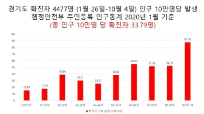 경기도 코로나19 인구 10만명당 발생비율, 장년·노년층서 눈에 띄게 높아 ○ 경기도민 10만명당 코로나19 발생 33.8명. 50대 이상 장년층과 노년층에서 확연히 높아 ○ 5일 0시 기준 경기도 확진자 전일 0시 대비 27명 늘어난 4,47...