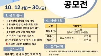 파주도시관광공사, ‘2020 열린 혁신 시민 아이디어 공모전’개최 파주도시관광공사(사장 손혁재, 이하 공사)는 오는 10월 12일부터 30일까지 ‘2020 열린 혁신 시민 아이디어 공모전’을 개최한다고...