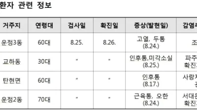 파주시 코로나19 93~96번 확진환자 발생 - 2020. 8. 27. 17시 기준 - ○ 확진환자 관련 정보 번호 거주지 연령대 검사일 확진일 증상(발현일) 감염추정경로 93 운정3동 60대 8.26. 8.27. 무증...
