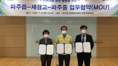 파주읍 지역사회 공헌 교육자원 공동활용 업무협약(MOU) 체결 파주시 파주읍은 지난 9일 세경고등학교, 파주중학교와 지역사회 공헌을 위한 교육자원 활용 등 공동협력을 위한 업무협약을 체결했다. 협약식에는 장문규 파주읍장, 이준화 세...