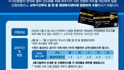 파주시, 지자체 최초 전시민 선불카드 일괄 발급 신청 - 코로나19 파주시 긴급생활안정지원금 10만원 지급용 - 개인이 별도 신청 없이 한번 방문으로 수령 가능 - 감염우려와 시민불편 해소 모범사례 될 듯 파주시가 시민들...