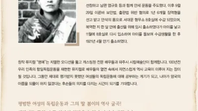 파주시, 창작뮤지컬‘명예’연말 공연 사전 예약 - 만삭의 독립운동가 임명애 지사 재조명 파주시는 오는 연말 공연될 창작 뮤지컬 명예의 원활한 관람을 위해 12월 2일부터 사회단체 및 학교, 군부대, 기업체 등의 단체관람 및...