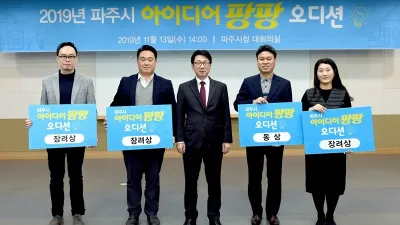 2019 파주시 아이디어 팡팡 오디션 성료 파주시가 지난 8월부터 500만 원의 주인공을 공모한 파주시민 아이디어 오디션이 지난 13일 파주시청 대회의실에서 개최됐다. 시민의 창의적인 아이디어를 모아 시정에 적극 반영하고자 실시한 ...