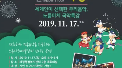 파평도서관, 신나는 예술여행‘노름마치 국악특강’공연 개최 파주시 파평도서관은 오는 17일 오후 4시 ‘신나는 예술여행–세계인이 선택한 우리음악, 노름마치 국악특강’을 개최한다. ...