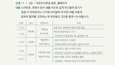 파주시 교하도서관 부모독서교육‘전지적 아이시점’개최 파주시 교하도서관은 지역 내 학부모를 대상으로 11월 13일부터 12월 11일까지 매주 수요일마다 하반기 ‘부모 독서 교육’을 개최한다. ...
