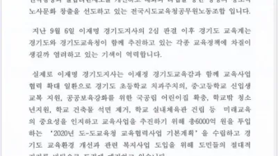 2019-11-08 02:17:09'경기도·도교육청의 교육정책은 계속 되어야 한다' - 시도 교육청 노동조합의 이재명 탄원 입장 발표