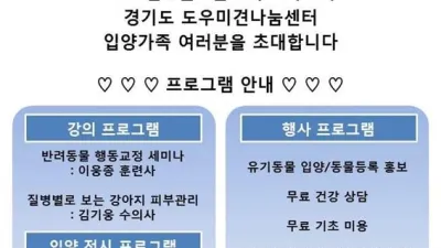 “반려견 사지말고 꼭 입양하세요” 입양가족 홈커밍 데이에 초대합니다! ○ 경기도 도우미견나눔센터 9월 8일(일) 홈커밍데이 개최 - 건강관리교육, 반려동물 행동강의, 질병 상담, 무료 미용, 입양사진 콘테스트, 반려동물퀴즈 등 다양한 행사 준비 -...