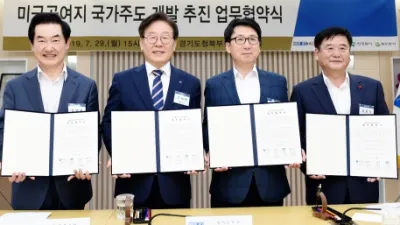 이재명 “미군공여지 국가주도개발 조속히 추진해야” 도·시군 협력체계 구성 왼쪽부터 안병용 의정부시장, 이재명 경기도지사, 최종환 파주시장, 최용덕 동두천시장 ○ 경기도-파주-의정부-동두천, 29일 미군공여지 국...