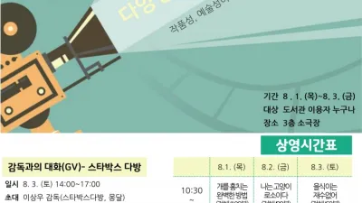 파주시 교하도서관, G-시네마‘다양성 영화제’개최 8월 1일부터 3일간, 이상우 감독과의 대화도 진행 파주시 교하도서관은 여름휴가철을 맞아 도서관 이용자들이 무더위를 피해 도서관에서 편...