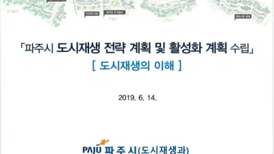 파주시 도시재생 전략계획 사전설명회 개최 - 도시재생계획 및 도시재생뉴딜사업 소개 파주시는 오는 14일 오후 3시30분 파주시 시민회관 소공연장에서 ‘파주시 도시재생 전략계획 사전설명회’를 개최한다...