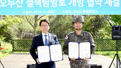 파주시, 오두산 철책탐방로 개방 협약 체결 파주시는 지난 2일 오두산 통일전망대에서 최종환 파주시장과 안병석 제9보병사단장이 참석한 가운데 오두산 철책탐방로 개방을 위한 협약 체결식을 가졌다. 이번...