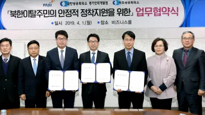 파주시, 북한이탈주민 안정적 정착 위한 업무협약 파주시는 1일 파주시청 비즈니스룸에서 대한상공회의소 경기인력개발원, 파주상공회의소와 북한이탈주민의 안정적인 정착을 위한 업무협약식을 가졌다. 이번 협약은 파주시에서 수립한 생활밀착형 ...