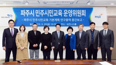 파주시 민주시민교육 운영위원회 위촉 및 연구용역 중간보고회 파주시는 29일 시청 비즈니스룸에서 제1기 민주시민교육 운영위원회 위원 위촉 및 민주시민교육 기본계획 수립에 따른 연구용역 중간보고회를 개최했다. 민주시민교육은 시민이 민주...