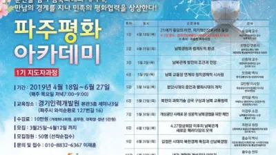 북맹(北盲)탈출 프로젝트~! 제1탄 , ‘파주평화아카데미’ 수강생 50명 모집 파주시가 ‘4.27 판문점 선언’ 1주년을 맞아 평화통일리더를 양성하고자 ‘파주평화아카데미’ 수강생을 오는 4월 ...