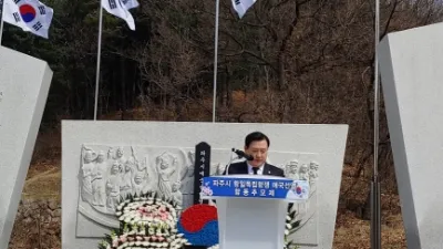파주시 항일독립항쟁 애국선열 합동추모제, 100년전 파주시 3.1운동의 숭고한 정신 기려 ▲부준효 광복회 파주지회장이 추모사를 하고 있다. 3월 28일, 파주시 광탄면 발랑리 소재 파주독립광탄공원에서 &ldq...