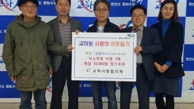 김종수 21세기 대표 교하동 저소득아동에 매월 장학금 정기후원 파주시 교하동은 지난 6일 김종수 파주시 21세기 회장이 소득가구 아동을 위해 교하동 지역사회보장협의체인 ‘교하사랑협의체’에 매월 장학금을 정기후원...