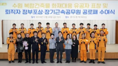 이재명, 수원 골든프라자 화재 진압 영웅 28명에 도지사 표창 수여 ○ 28일, 수원 골든프라자 화재대응 유공자 28명 표창식 거행 - 소방15명, 수원시공무원2명, 경찰3명, 의용소방대3명, 의료진3명, 시민2명 수상 ○ 신속한 대피유도와 화재진압으로 사...