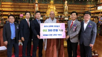 파주시 심학산 약천사, 교하동 어려운 이웃에 행복바라미 성금 전달 파주시 교하동 행정복지센터(동장 윤덕규)는 파주시 심학산에 위치한 대한불교 조계종 약천사(주지스님 허정)에서 지난 22일 ‘부처님오신날’을 맞아 봉축 법요식을 열고 행복바라미와 약천사 자비나눔 봉사회(...