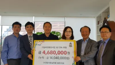 (사)참사랑실천회 파주지회, 아동자립지원에 3년간 1,404만원 후원 파주시는 (사)참사랑실천회 파주지회에서 지난 25일 파주시 저소득가정 아동을 위한 ‘디딤씨앗통장사업’ 후원금 468만원을 기탁했다고 밝혔다. ‘디딤씨앗통장사업’은 저소득가정 아동들이 사회 진출 ...