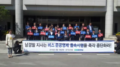 경기도의회 더불어민주당 “버스준공영제 졸속시행 중단 촉구” 집회 진행 행정사무조사 특별위원회를 통해 책임을 엄격히 물을 것 경기도의회 더불어민주당(대표직무대행 윤재우)은 4월 10일(화) 의원총회가 끝난 후 의회 정문 앞에서 진행된 집회를 통해 “경기도는 광역버스...