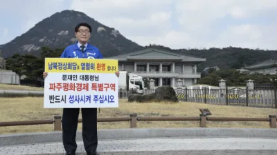 우춘환파주시장예비후보 1인시위 오늘 저는 남북 정상회담 개최를 환영함과 동시에 파주 평화 경제 특구의 조속한 지정을 촉구하는 “청와대 앞 1인 시위”를 하였습니다. 한반도의 평화 정착과 한반도 비핵화를 위한 진전된 결과를 만드는 계기가 될 남북정상회담 개최를 ...
